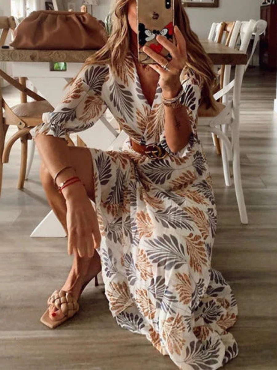 A full-length dress with a V-neckline and a sweeping hem. The waist shaping and graceful line make it suitable for weddings, receptions, and daytime gatherings across spring and summer.