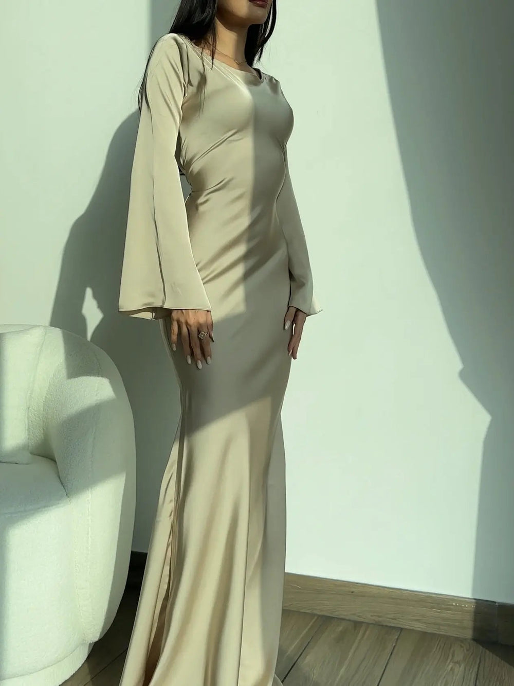 Women’s Satin Lace-Up Waist Maxi Dress with Long Fluted Sleeves