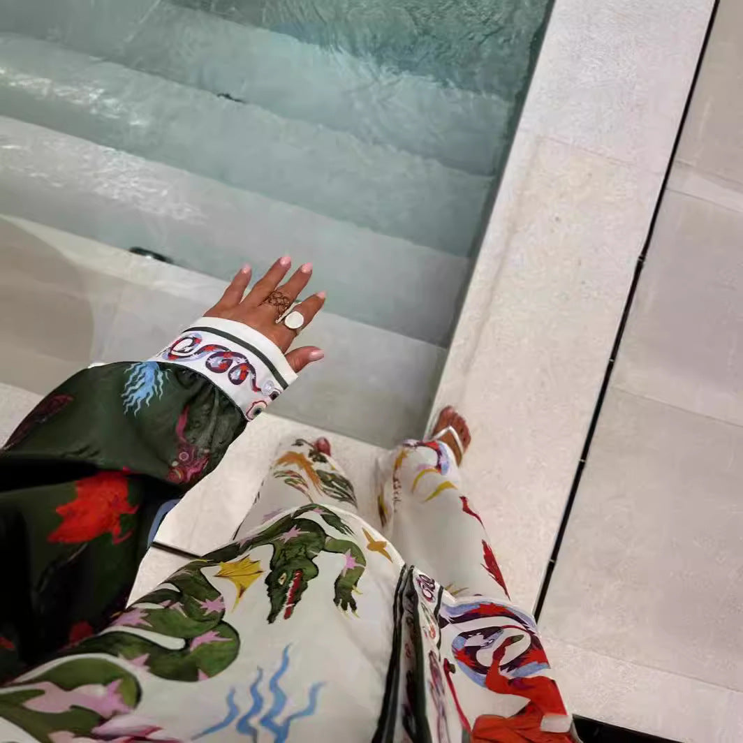 A relaxed linen two-piece shaped with a flowing long-sleeve top and wide-leg pants, finished with an intricate all-over print. The open neckline brings a gentle frame, while the draped top meets a fluid pant that shifts gracefully with each step. A standout set suited for seaside lunches, resort afternoons, or warm holiday evenings.