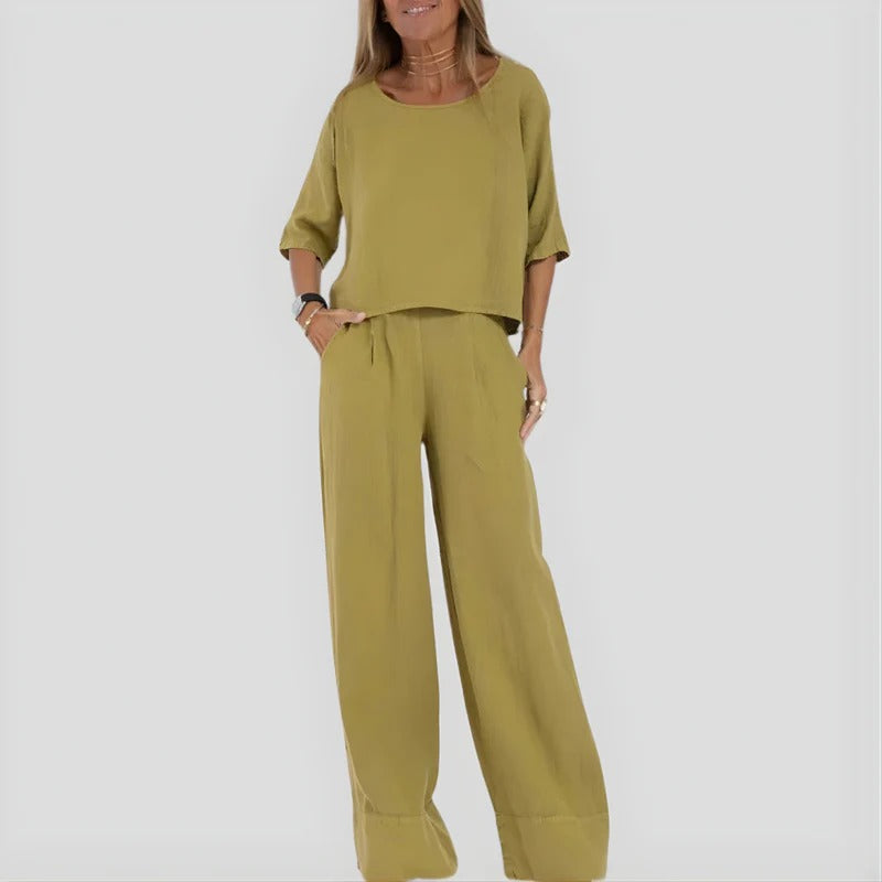 A calm warm-season set shaped with a loose cotton top and wide leg pants. The top falls in a gentle drape with a round neckline, while the pants sit with a flexible waist and practical side pockets. The coordinated silhouette suits slow mornings, errands, and summer days where a paired look feels just right.