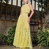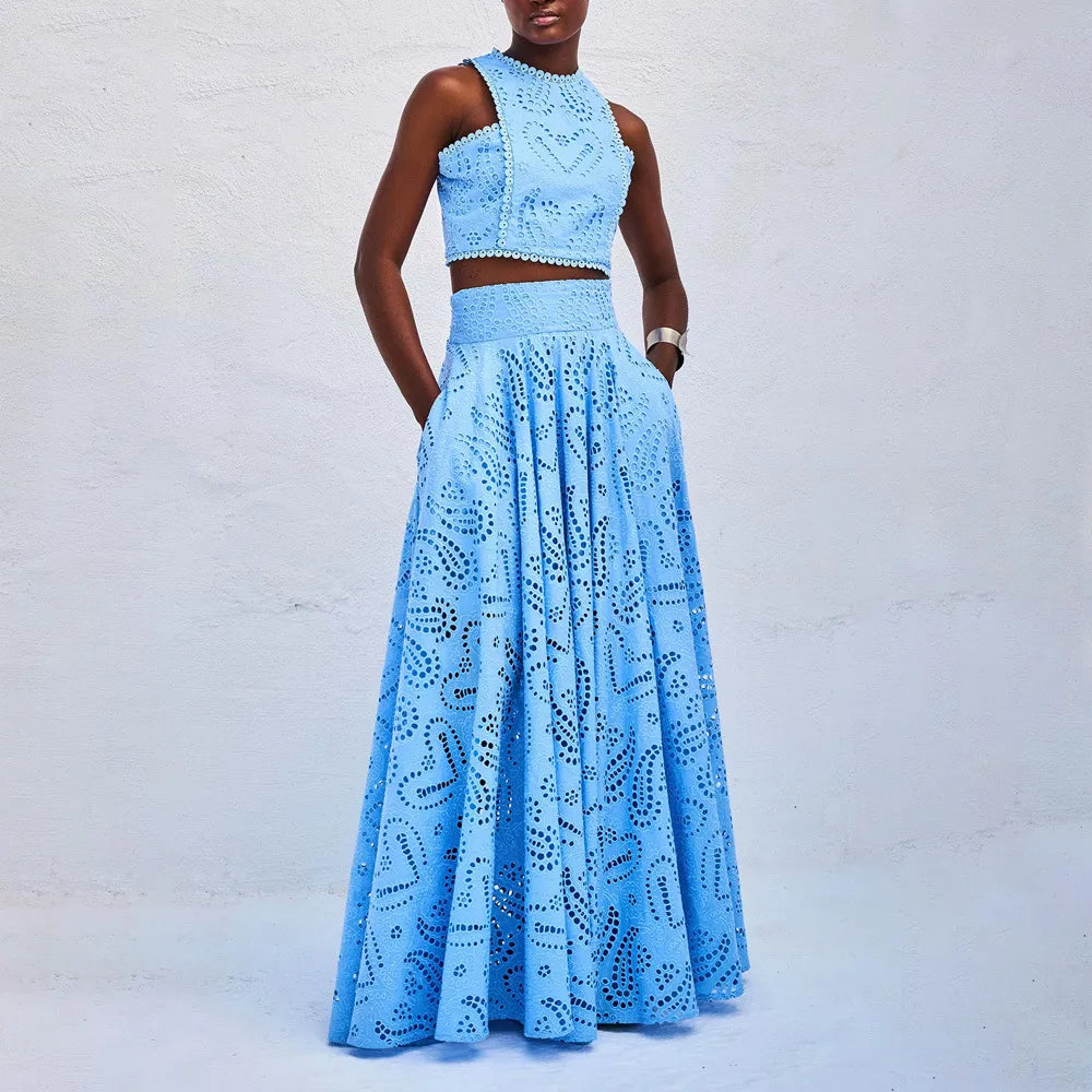 A radiant summer ensemble detailed with intricate cutwork embroidery. The cropped high-neck top pairs with a sweeping A-line maxi skirt, both traced with scalloped edging for delicate dimension. The cinched waist shapes the silhouette, creating a balanced outline for garden parties, seaside dinners, or resort evenings.