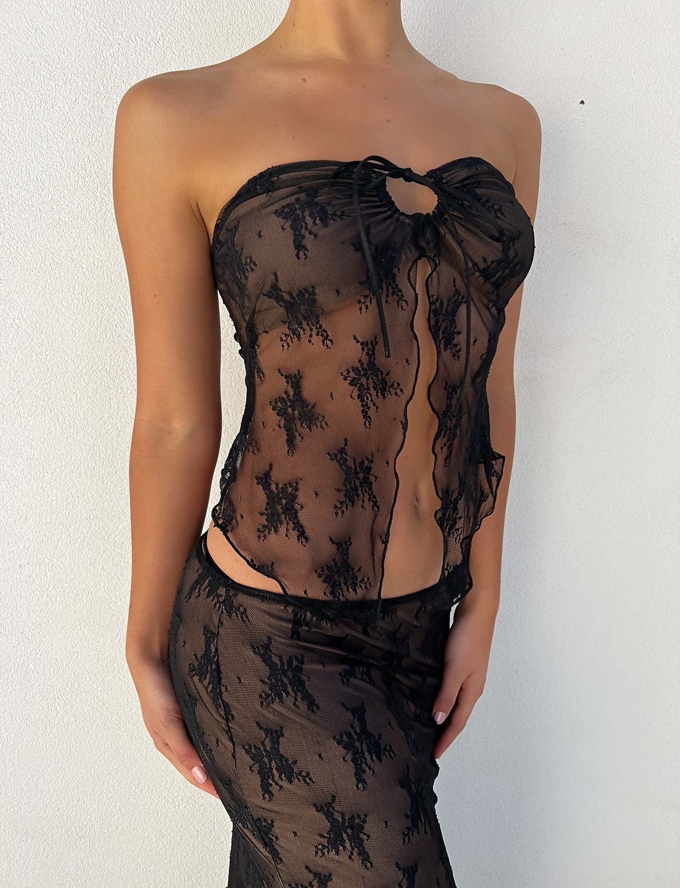 A sultry two-piece set that redefines modern romance. Crafted from delicate lace, the strapless top features a ruched tie-front and flared hem, perfectly paired with a matching floor-length skirt that traces the hips before falling to the hem. The sheer finish creates alluring contrast, ideal for evenings that celebrate bold femininity.