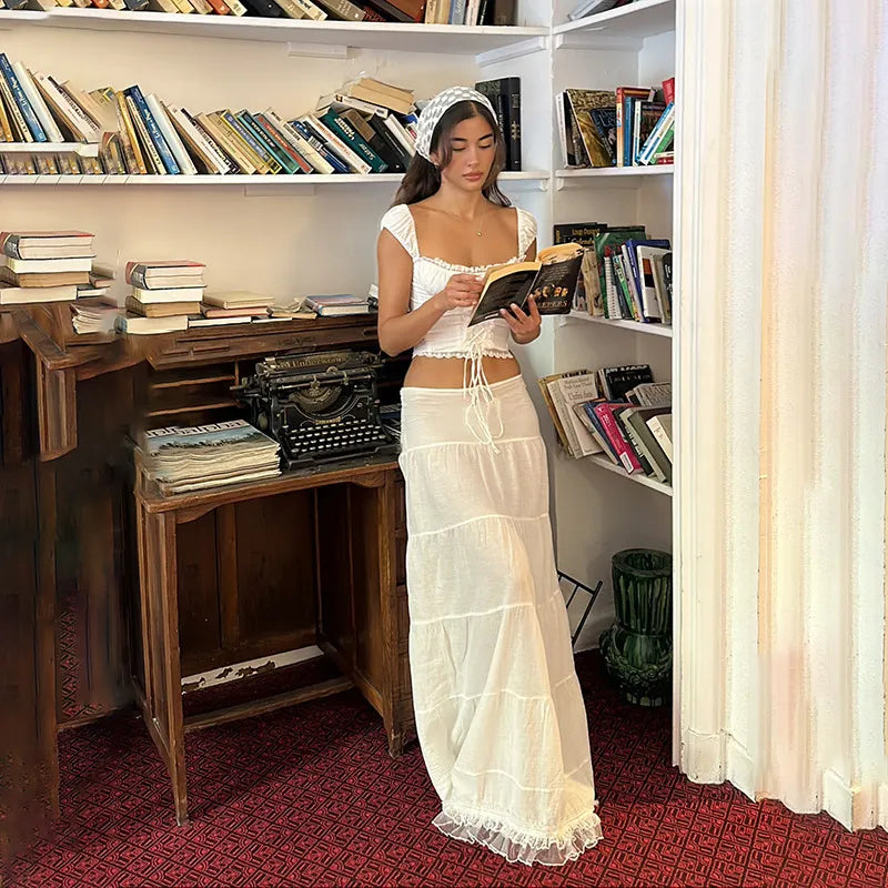 A romantic two-piece that evokes Mediterranean summer allure. The corset-style crop top features ruched cups, a lace-up front, and delicate cap sleeves that frame the shoulders with feminine poise. The matching tiered maxi skirt drapes to the floor, creating a flowing, feminine silhouette perfect for garden lunches, sunset strolls, or warm evening gatherings.